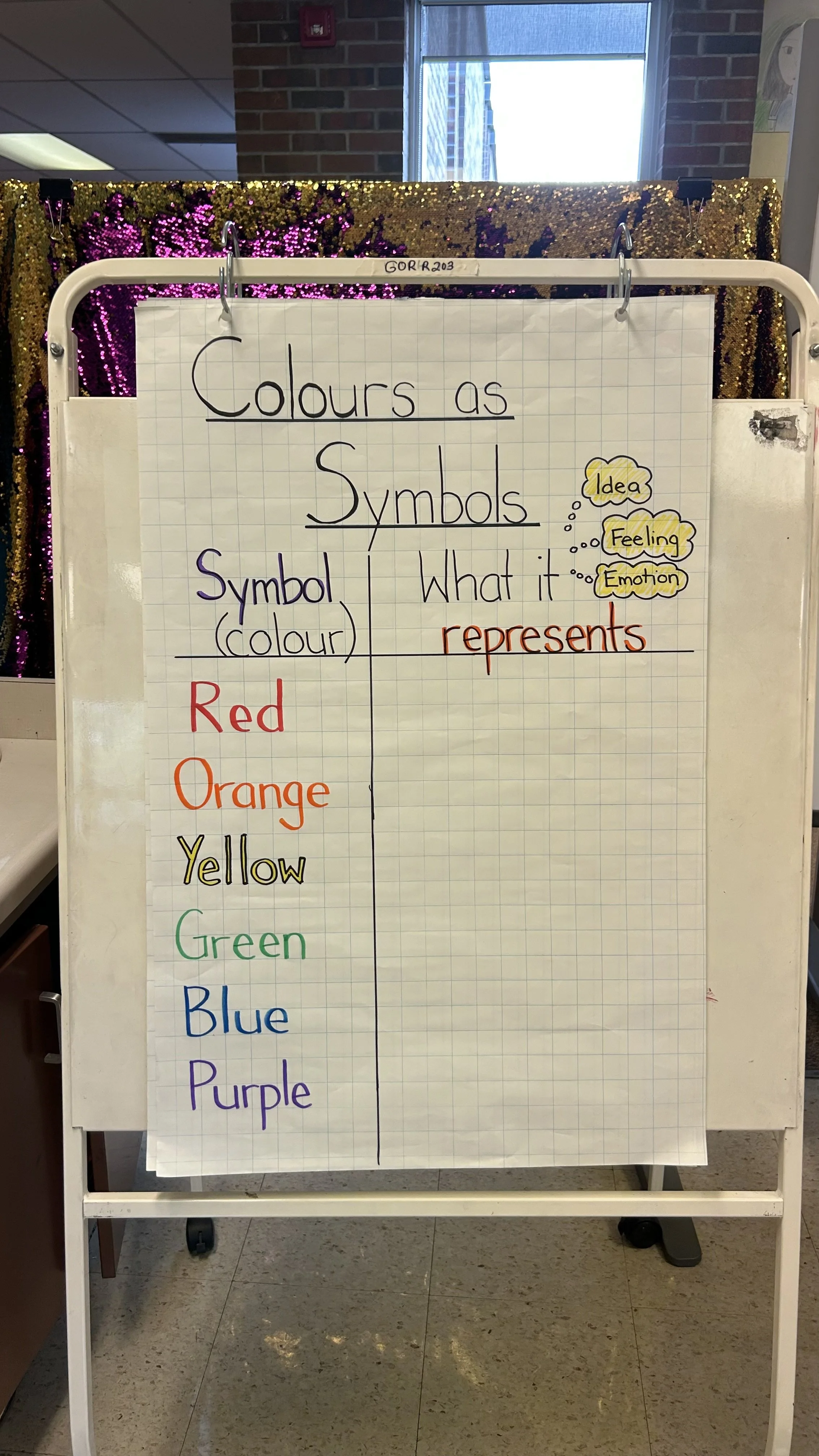 This classroom display and experience grew from a literacy-based inquiry centered on We Are Water Protectors (by Carole Lindstrom and illustrated by Michaela Goade), a story that explores environmental stewardship and Indigenous symbolism. Preceding this, I taught a lesson on how colours can represent different emotions, followed by lessons on symbolism through the Seven Grandfather Teachings. These teachings further extended into learning about Indigenous cultures, powwows, and contemporary Indigenous voices.