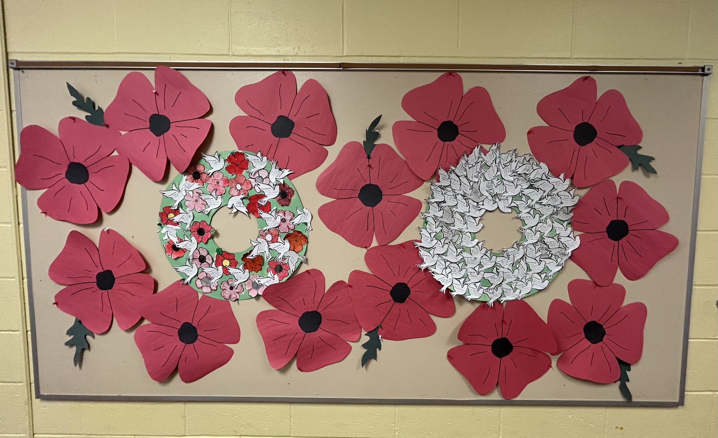 The Remembrance Day hallway display was designed with student reflection and utility in mind. Students contributed their reflections on peace and remembering those who have experienced war. Poppies were used during our school-wide assembly during the performance of In Flanders Fields by John McCrae.